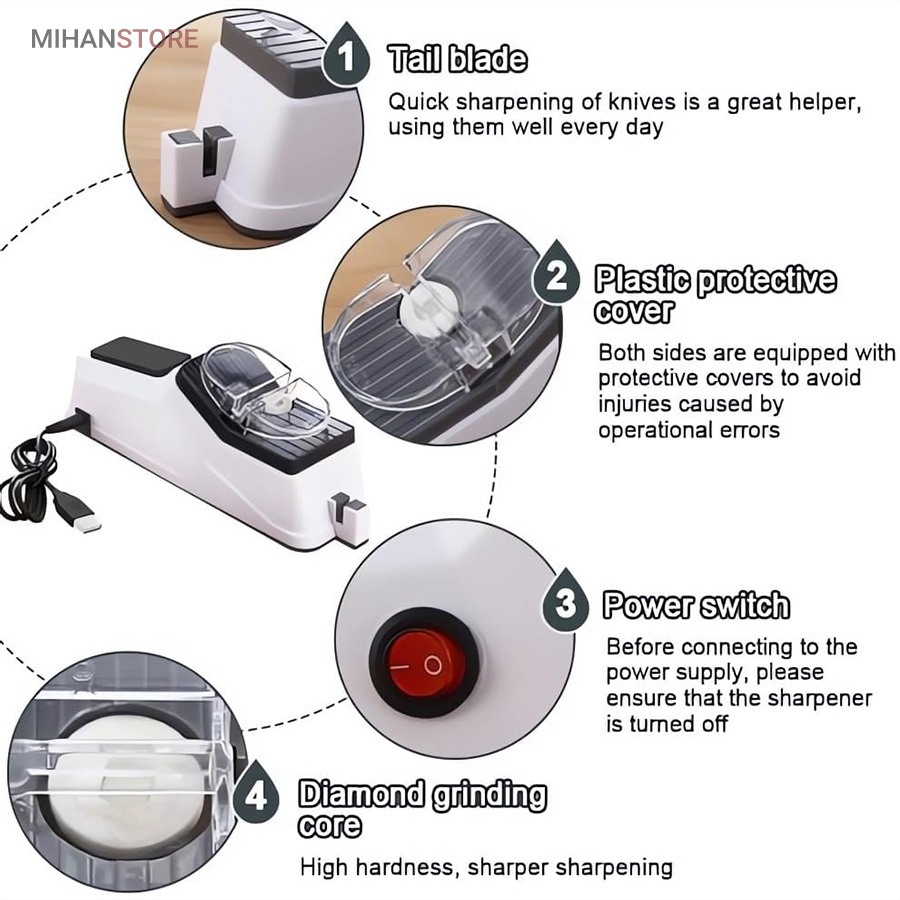 محصولی پرکاربرد که وجود آن در هر آشپزخانه ای لازم است. چاقو تیز کن برقی در کوتاه ترین زمان ممکن سطح انواع لوازم نوک تیز مانند کاردهای گوشت بری، میوه بری و حتی قیچی را تیز خواهد نمود که این امر سرعت کار پخت و پز و خیاطی شما را افزایش خواهد داد. وجه تمایز این نمونه با نمونه های قدیمی، کوچک و قابل حمل بودن محصول است. همچنین در بخش قرارگیری چاقو کاور محافظ قرار داده شده تا از آسیب احتمالی جلوگیری نماید. دستگاه چاقو تیز کن با کابل USB شروع به کار می کند و جنس دسته و بدنه آن از پلاستیک مرغوب است.