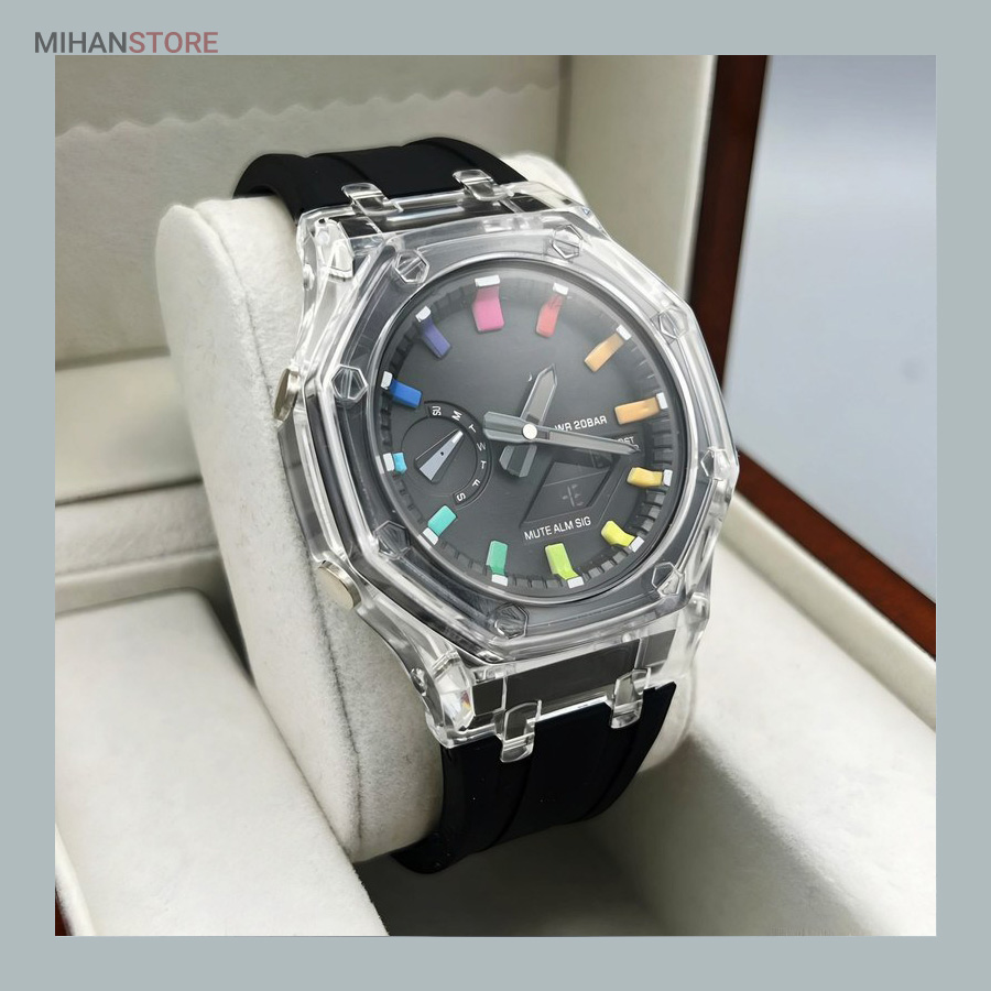 ساعت مچی ضدآب کاسیو جی شاک - GA2100، یک ساعت مدرن و مقاوم است که برای افراد فعال و علاقهمند به سبکهای ماجراجویانه طراحی شده است. این ساعت مچی جی شاک دارای بند رابر مشکی و صفحه مشکی است که به آن ظاهری اسپرت و شیک میبخشد. جنس رابر بند، علاوه بر سبک بودن، بسیار مقاوم و ضد ضربه است که آن را برای استفاده روزمره و شرایط سخت مناسب میکند. این ساعت دو موتوره می باشد و به صورت های کپی (با کیفیت فوق العاده بالا) تولید شده است و همراه با جعبه ای شکیل عرضه می شود.